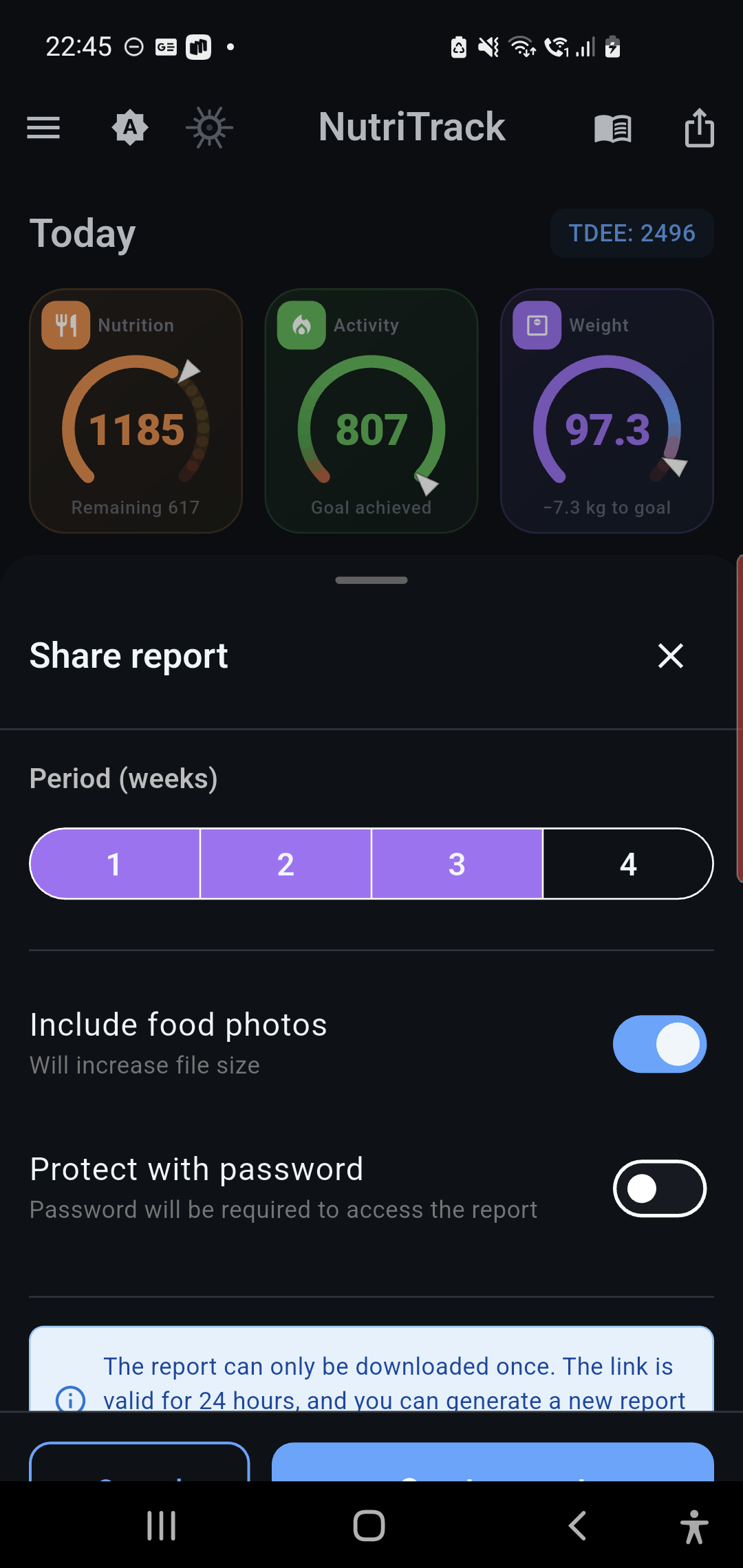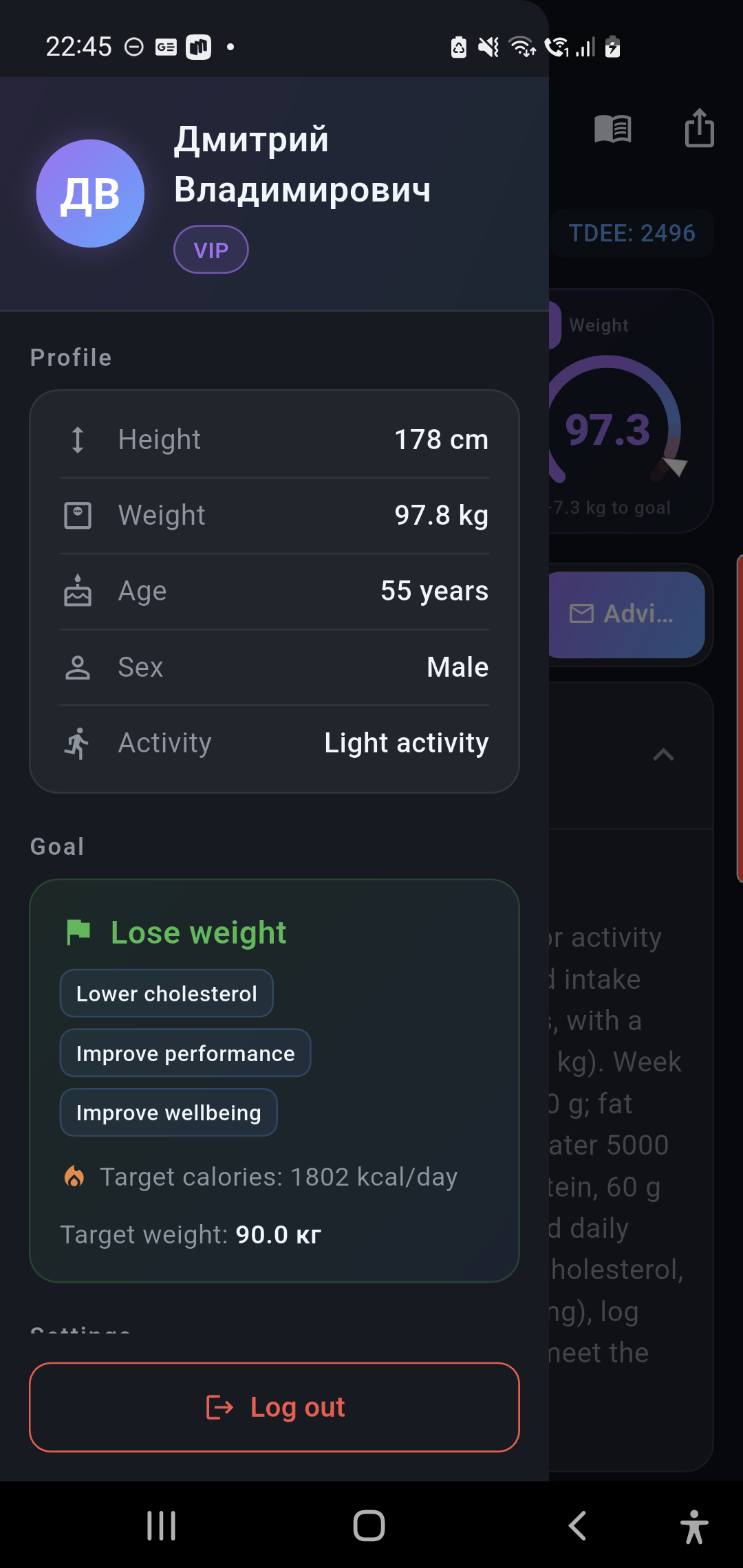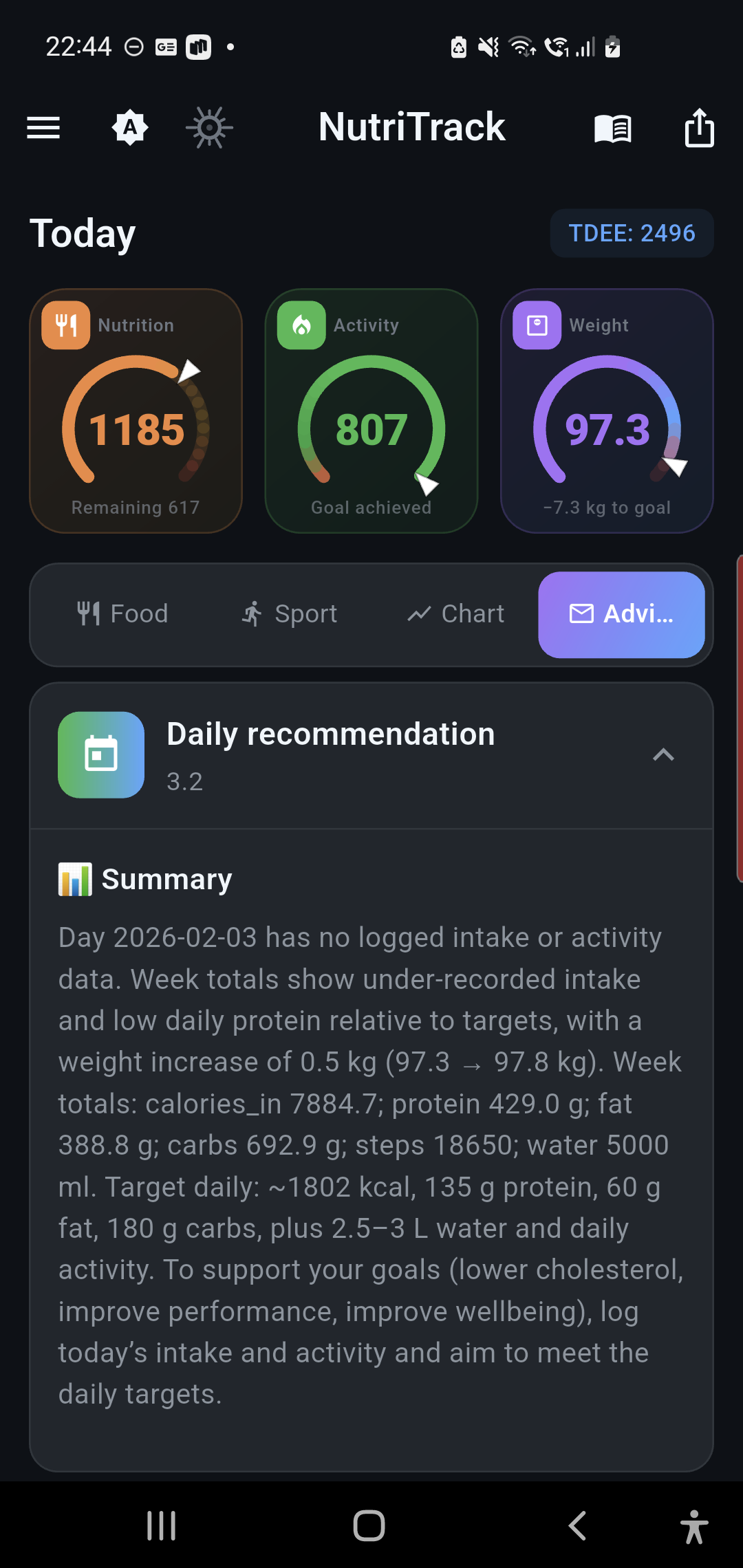 An AI coach analyzes your progress and suggests how to reach your goal — lose, gain, or maintain.