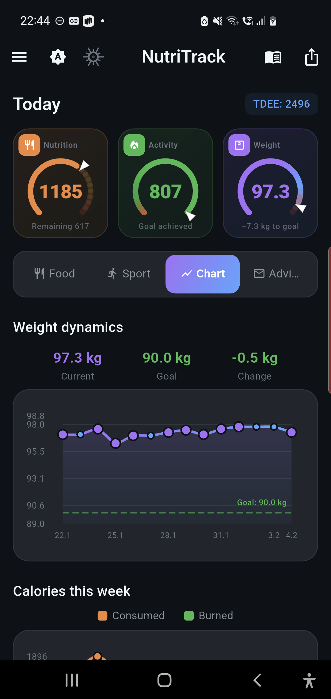 An AI coach analyzes your progress and suggests how to reach your goal — lose, gain, or maintain.
